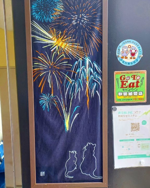 てことで、店の外の手ぬぐいを花火にしました🏮👘🎆