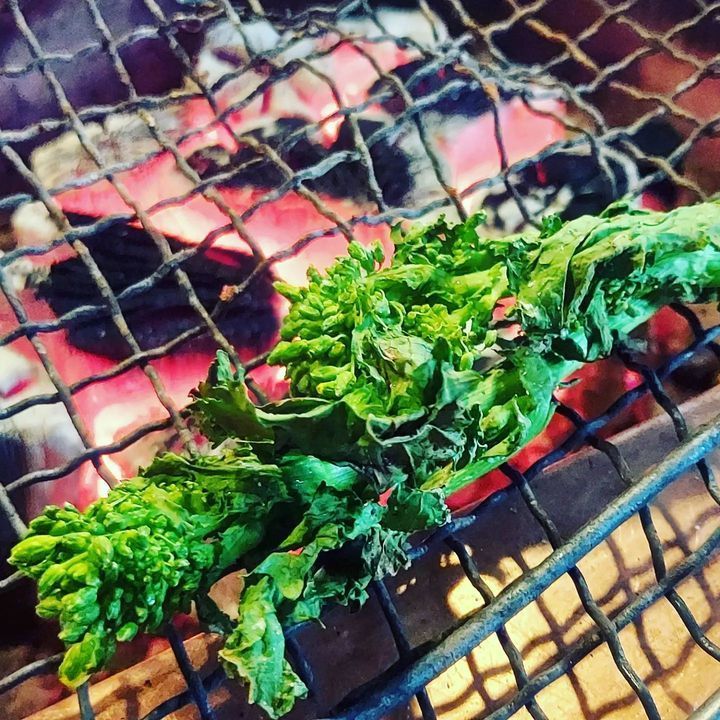天ぷらやおひたしにすることが多いと思いますが、炭火でじっくり焼くと葉の芳ばしさ、全体の甘さ、芯のジューシーさが楽しく味わえます♪